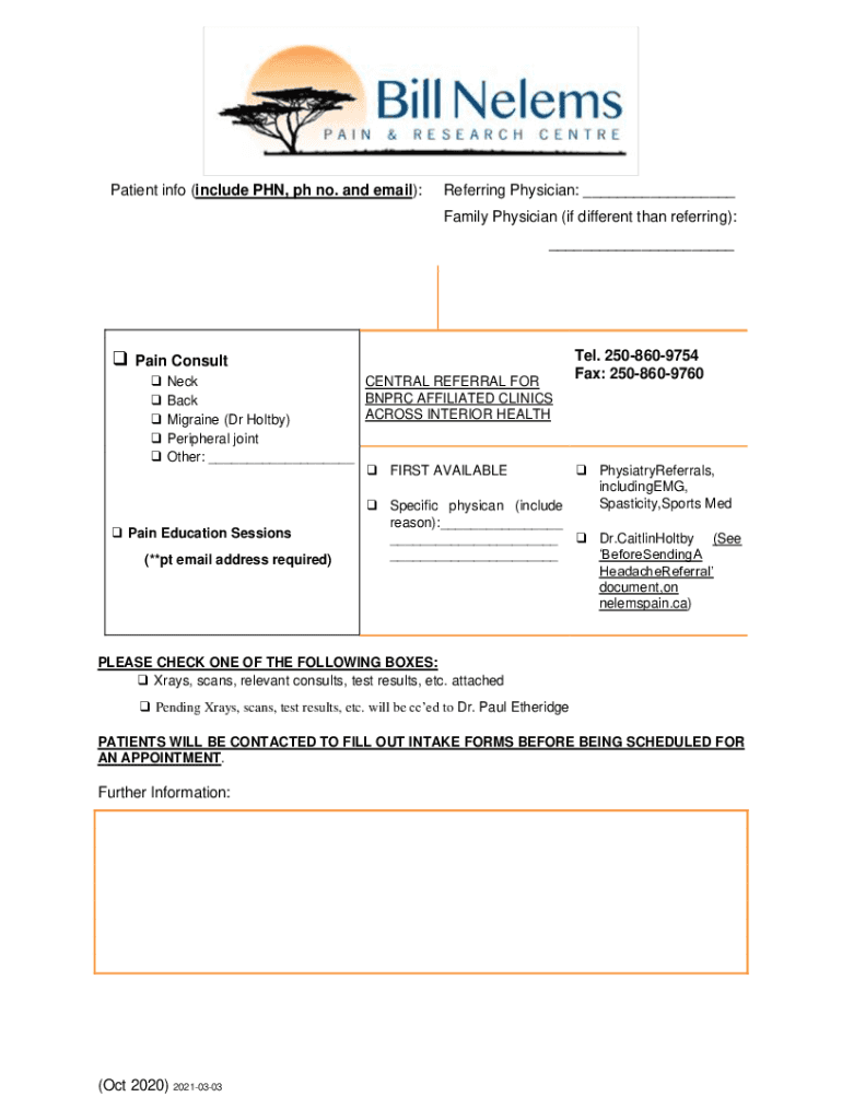 Patient info (include PhD, pH no. and email):Referring Physician: Family Physician (if different from referring): Pain Consult Neck CENTRAL REFERRAL FOR BNP RC AFFILIATED CLINICS Back ACROSS INTERIOR