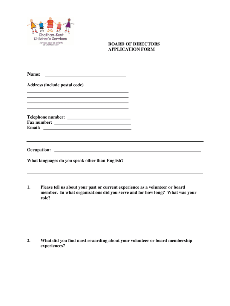 BOARD OF DIRECTORS APPLICATION Forename: Address (include postal code) Telephone number: Fax number: Email: Occupation: What languages do you speak other than English? 1. Please tell us about your