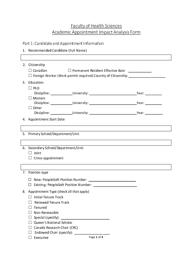 Faculty of Health Sciences Academic Appointment Impact Analysis Form Part 1: Candidate and Appointment Information 1. Recommended Candidate (Full Name)2. Citizenship Canadian Permanent Resident Effective