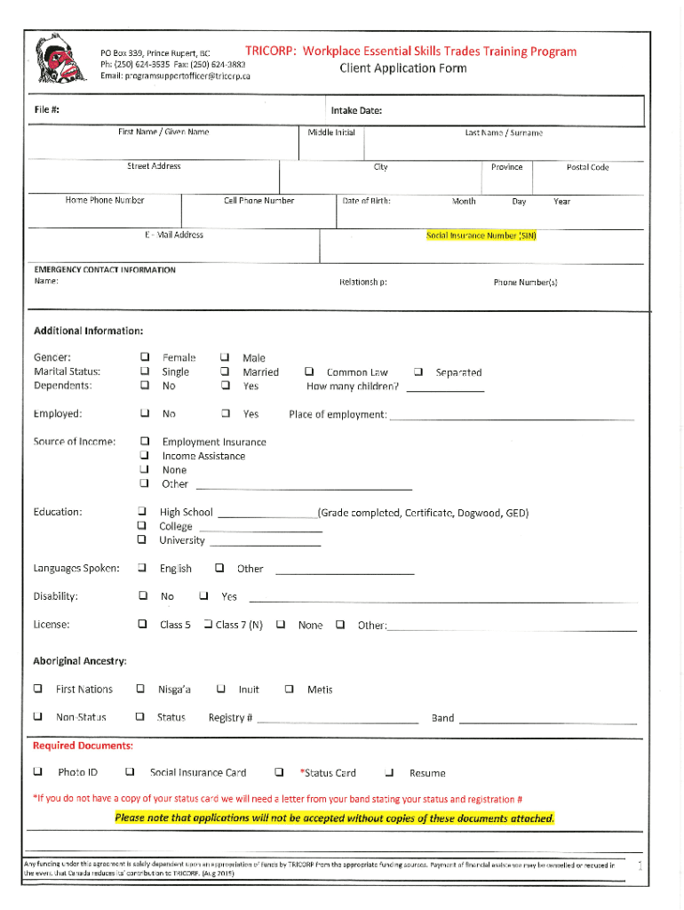 PO Box 339, prince Rupert, BC TRICORN: Workplace Essential Skills Trades Training Program