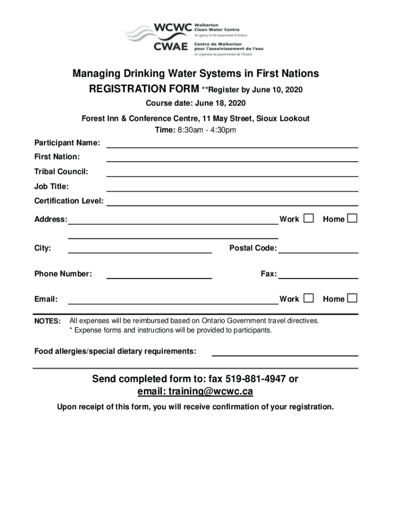 Managing Drinking Water Systems in First Nations REGISTRATION FORM **Register by June 10, 2020, Course date: June 18, 2020, Forest Inn & Conference Center, 11 May Street, Sioux Lookout Time: 8:30am