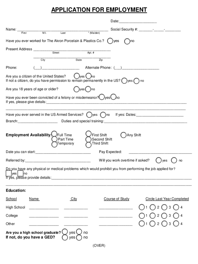 APPLICATION FOR EMPLOYMENT Date: Name: Social Security #: First. I. Last* (Maiden)Have you ever worked for The Akron Porcelain & Plastics Co.? Yes present Address Street. # iPhone:State() Alternate