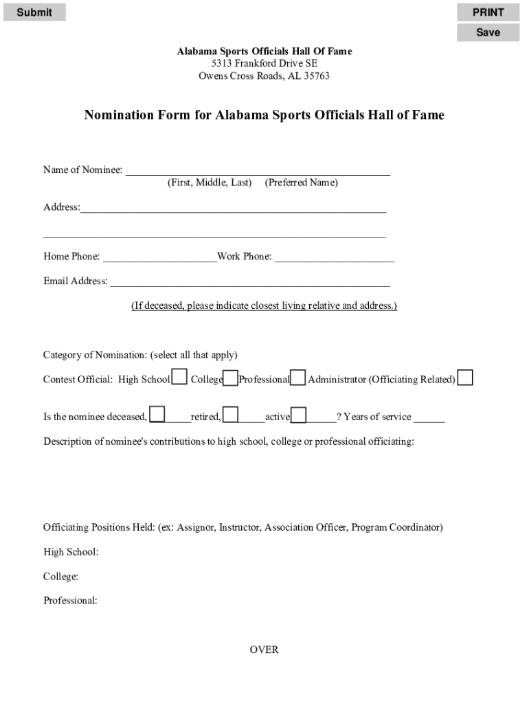 Individuals or organizations seeking to nominate a person for induction into the Alabama Sports Hall of Fame are typically required to file a nomination form.