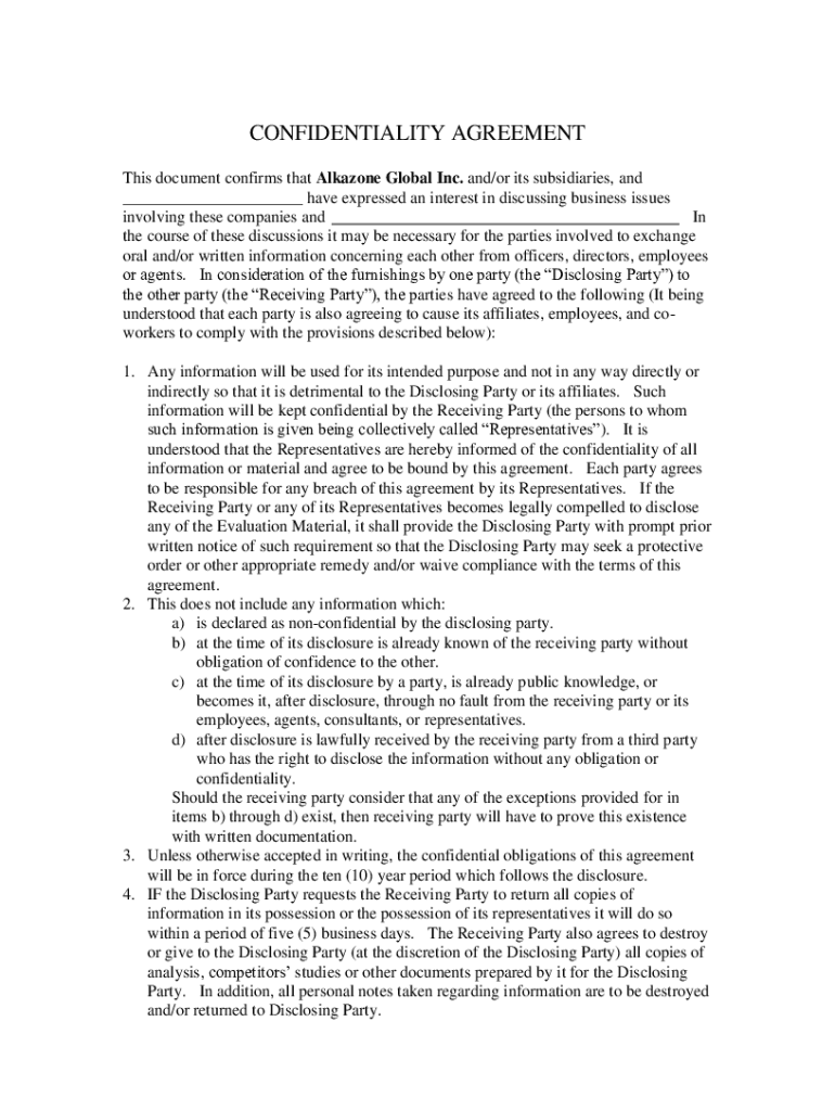 CONFIDENTIALITY AGREEMENT This document confirms that Alkaline Global Inc. and/or its subsidiaries, and have expressed an interest in discussing business issues involving these companies and In the