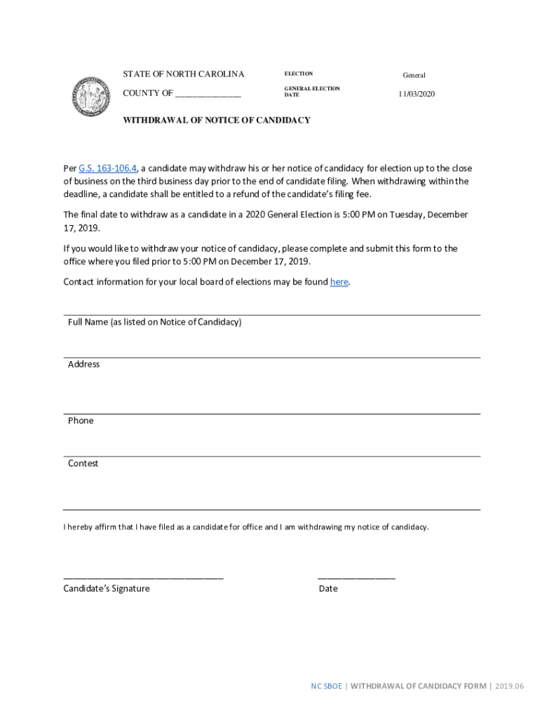 STATE OF NORTH CAROLINAELECTIONCOUNTY OF GENERAL ELECTION DATEGeneral11/03/2020WITHDRAWAL OF NOTICE OF Candidacy G.S. 163106.4, a candidate may withdraw his or her notice of candidacy for election
