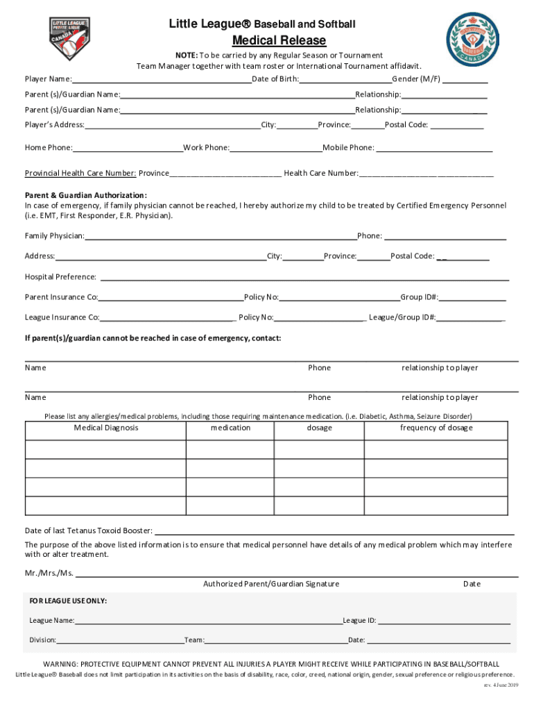 Little League Baseball and Softball Medical Release NOTE: To be carried by any Regular Season or Tournament Team Manager together with team roster or International Tournament affidavit. Date of Birth:
