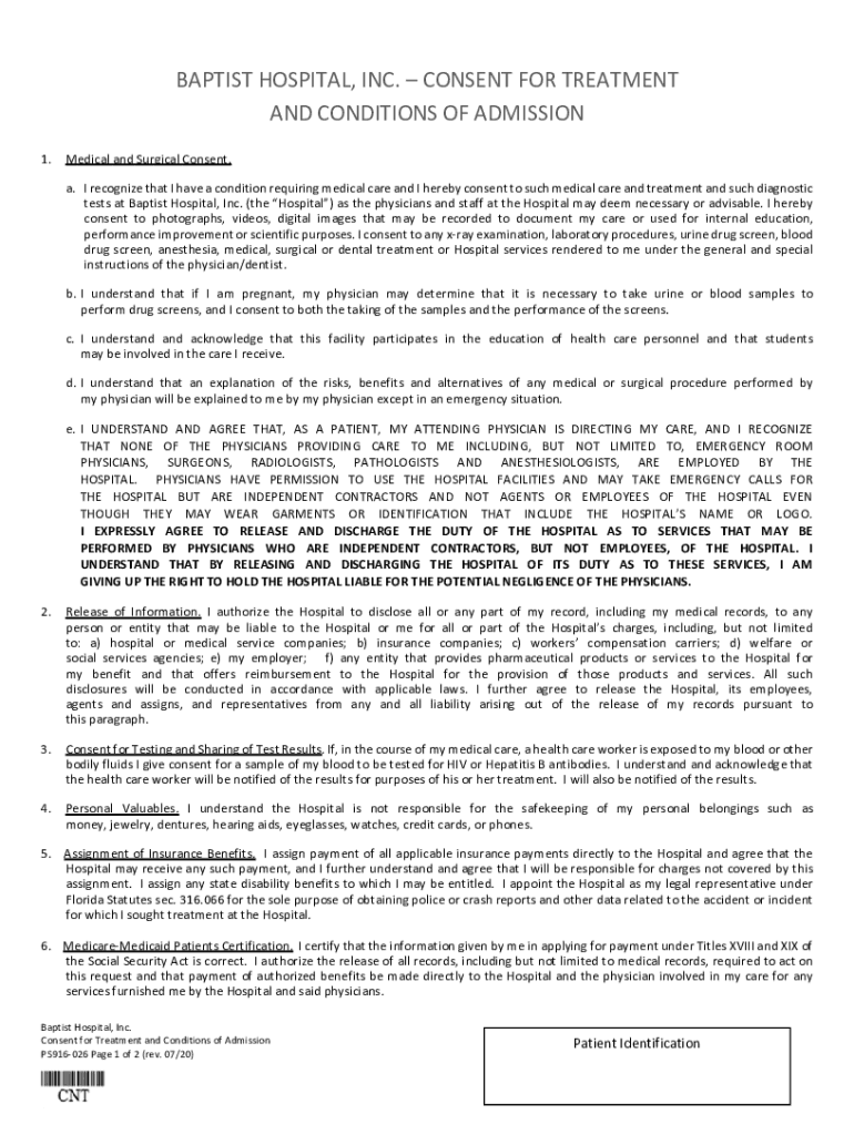 BAPTIST HOSPITAL, INC. CONSENT FOR TREATMENT AND CONDITIONS OF ADMISSION 1. Medical and Surgical Consent. a. I recognize that I have a condition requiring medical care and I hereby consent to such