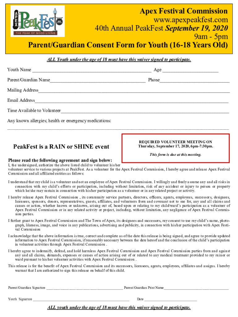 Apex Festival Commission www.apexpeakfest.com 40th Annual Weakest September 19, 2020 9am 5pm Parent/Guardian Consent Form for Youth (1618 Years Old) ALL Youth under the age of 18 must have this waiver