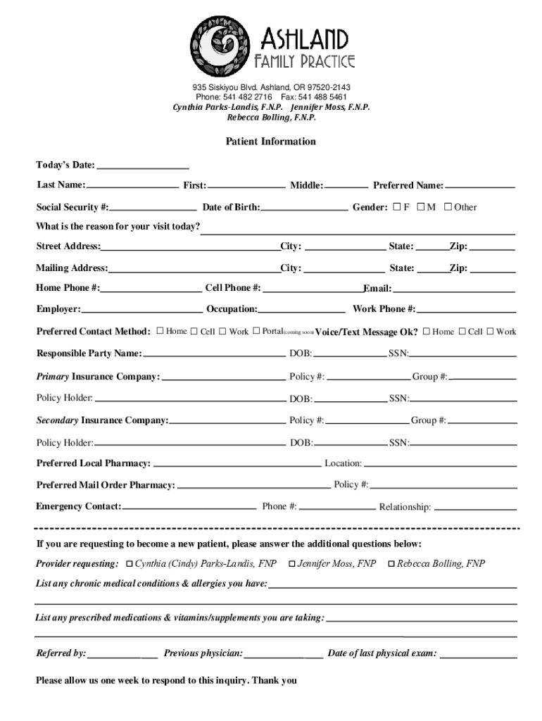 935 Miskito Blvd. Ashland, OR 975202143 Phone: 541 482 2716 Fax: 541 488 5461Cynthia Parkland, F.N.P. Jennifer Moss, F.N.P. Rebecca Bowling, F.N.P. Patient Information Today's Date: Last Name:First:Social