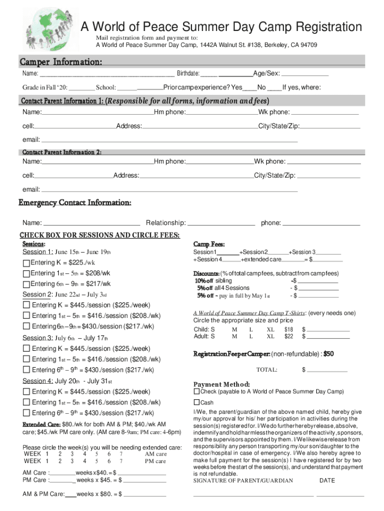 A World of Peace Summer Day Camp Registration Mail registration form and payment to: A World of Peace Summer Day Camp, 1442A Walnut St. #138, Berkeley, CA 94709Camper Information: Name: Birthdate: