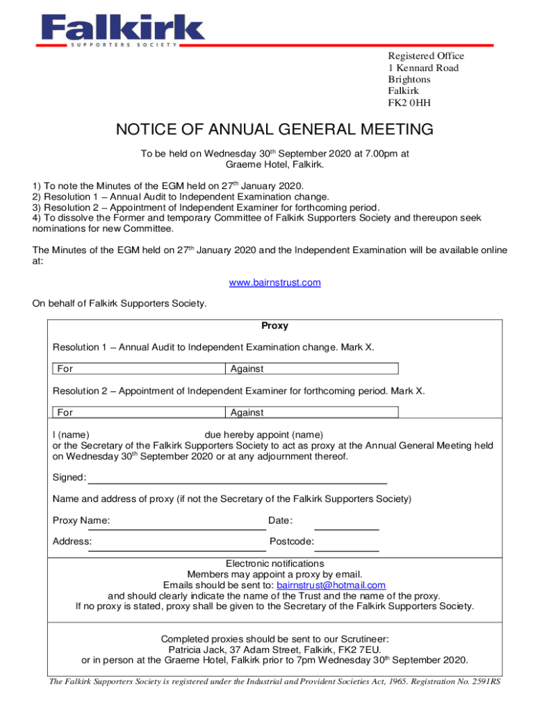 Registered Office 1 Dennard Road Brighton's Selkirk FK2 0HHNOTICE OF ANNUAL GENERAL MEETING To be held on Wednesday 30th September 2020 at 7.00pm at Game Hotel, Selkirk. 1) To note the Minutes of