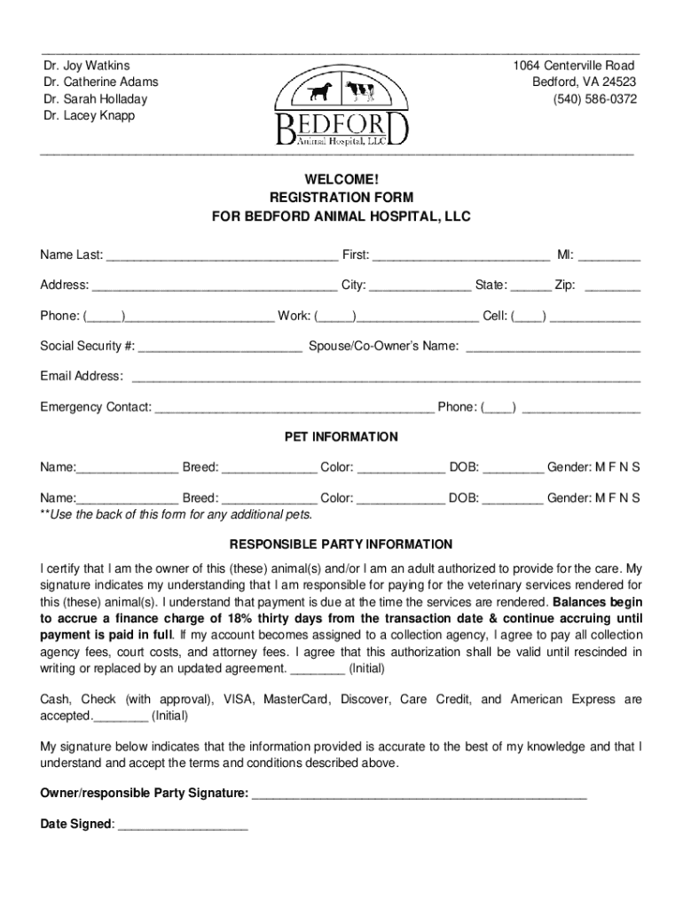 Dr. Joy Watkins 1064 Centerville Road Dr. Catherine Adams Bedford, VA 24523 Dr. Sarah Holladay (540) 5860372 Dr. Lacey Knapp WELCOME! REGISTRATION FORM FOR BEDFORD ANIMAL HOSPITAL, LLC Name Last: