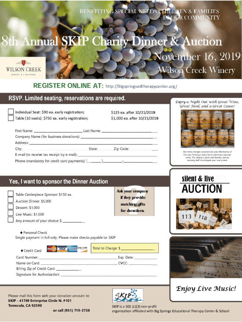 REGISTER ONLINE AT’D HTTP://bigspringsedtherapycenter.org/ 'Enjoy a Night Out Wi-Fi (great Wine, (great :Food, and a (great Cause! Individual Seat: $90 ea. early registration;$125 ea. after 10/21/2019Table