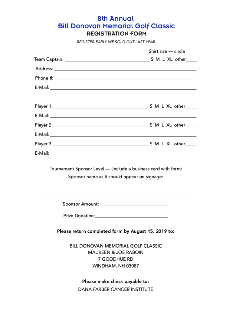 8th Annual Bill Donovan Memorial Golf Classic REGISTRATION FORM REGISTER EARLY WE SOLD Our LAST YEAR. Shirt size circle Team Captain: S M L XL other Address: Phone #: Email: Player 1. S M L XL other