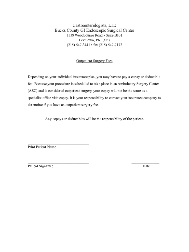 Gastroenterologists, LTD Bucks County GI Endoscopic Surgical Center 1339 Woodburn Road Suite B101 Levittown, PA 19057 (215) 5473441 fax (215) 5477172Outpatient Surgery FeesDepending on your individual