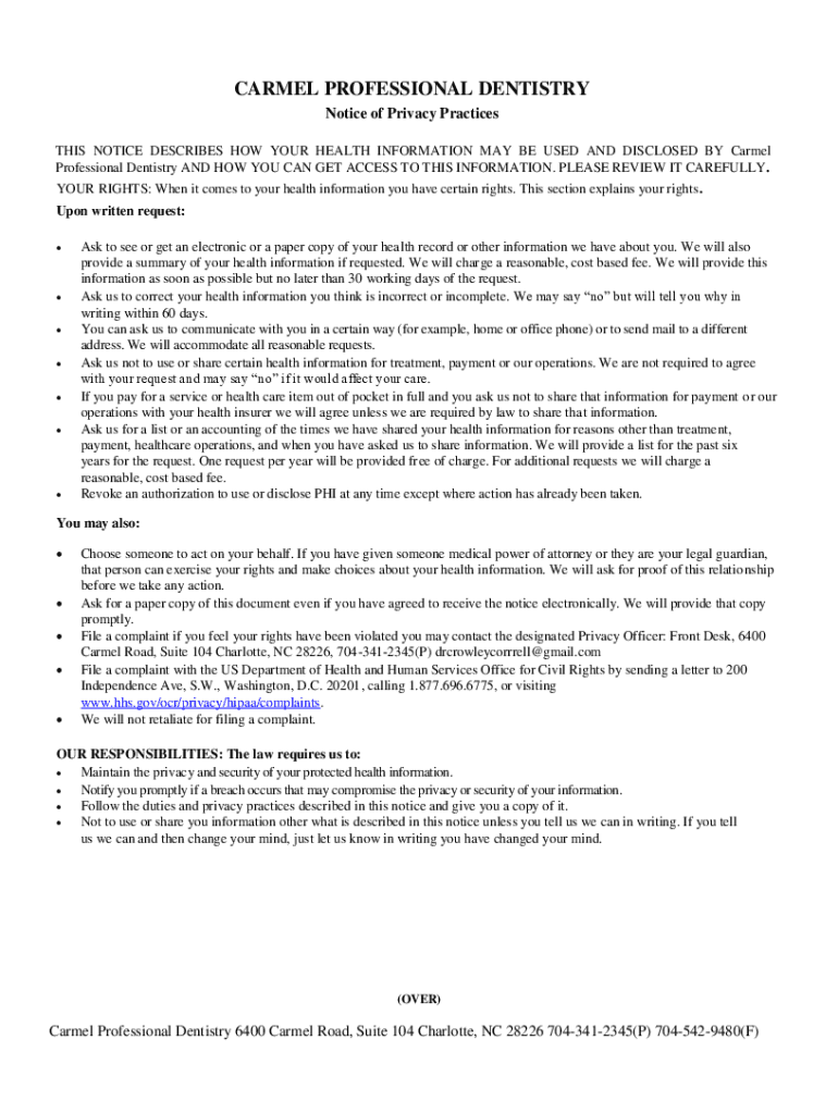 CARMEL PROFESSIONAL DENTISTRY Notice of Privacy Practices THIS NOTICE DESCRIBES HOW YOUR HEALTH INFORMATION MAY BE USED AND DISCLOSED BY Carmel Professional Dentistry AND HOW YOU CAN GET ACCESS TO