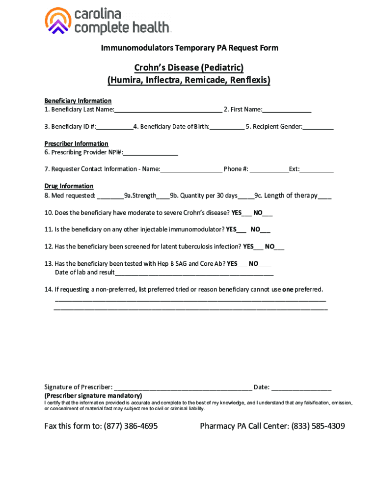 Immunomodulators Temporary PA Request FormCrohns Disease (Pediatric)(, Inflected, Reflexes)Beneficiary Information 1. Beneficiary Last Name: 3. Beneficiary ID #:2. First Name: 4. Beneficiary Date
