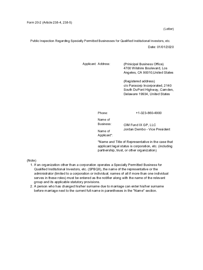 Form 202 (Article 2384, 2385) (Letter) Public Inspection Regarding Specially Permitted Businesses for Qualified Institutional Investors, etc. Date: 01/01/2020Applicant: Address:(Principal Business