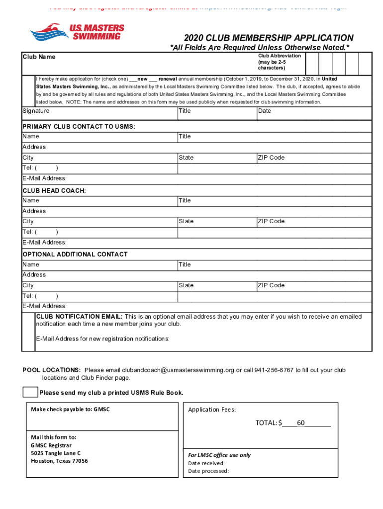 You may also register and preregister online at https://www.usms.org/clubcentral/clublogin2020 CLUB MEMBERSHIP APPLICATION *All Fields Are Required Unless Otherwise Noted.* Club Namely Abbreviation