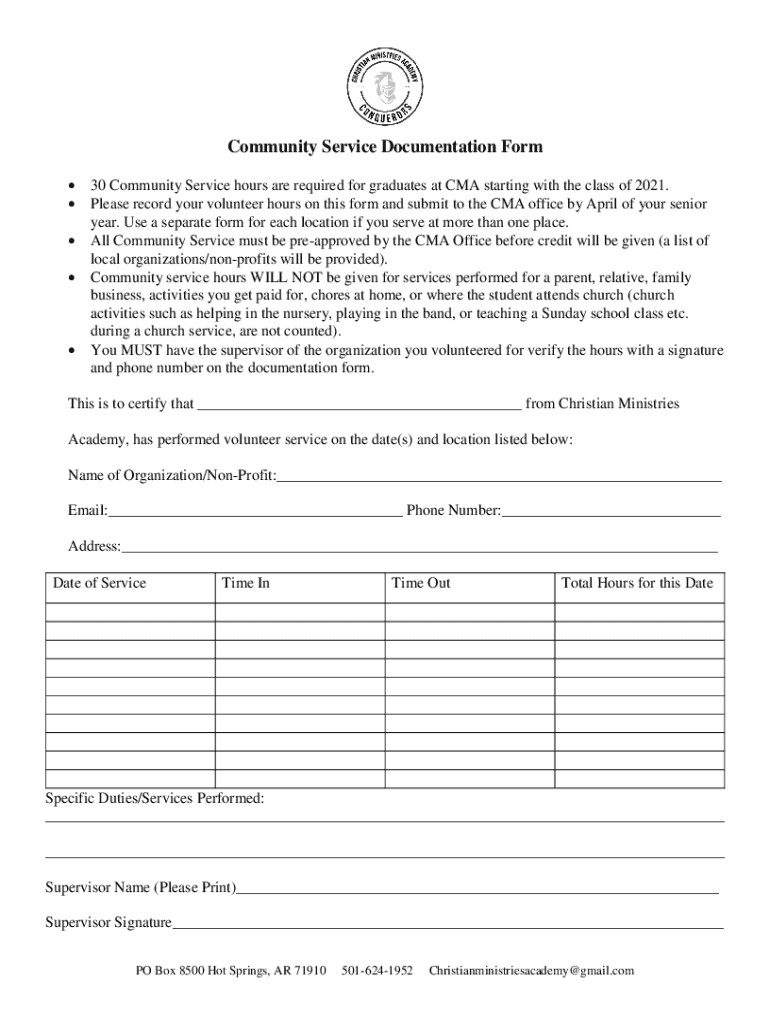 Community Service Documentation Form 30 Community Service hours are required for graduates at CMA starting with the class of 2021. Please record your volunteer hours on this form and submit to the