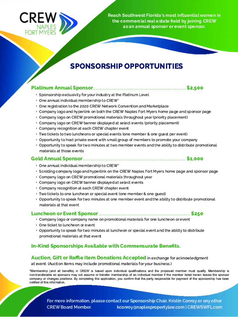 Reach Southwest Florida's most influential women in the commercial real estate ELD by joining CREW as an annual sponsor or event sponsor. SPONSORSHIP OPPORTUNITIES Platinum Annual Sponsor..................................................................