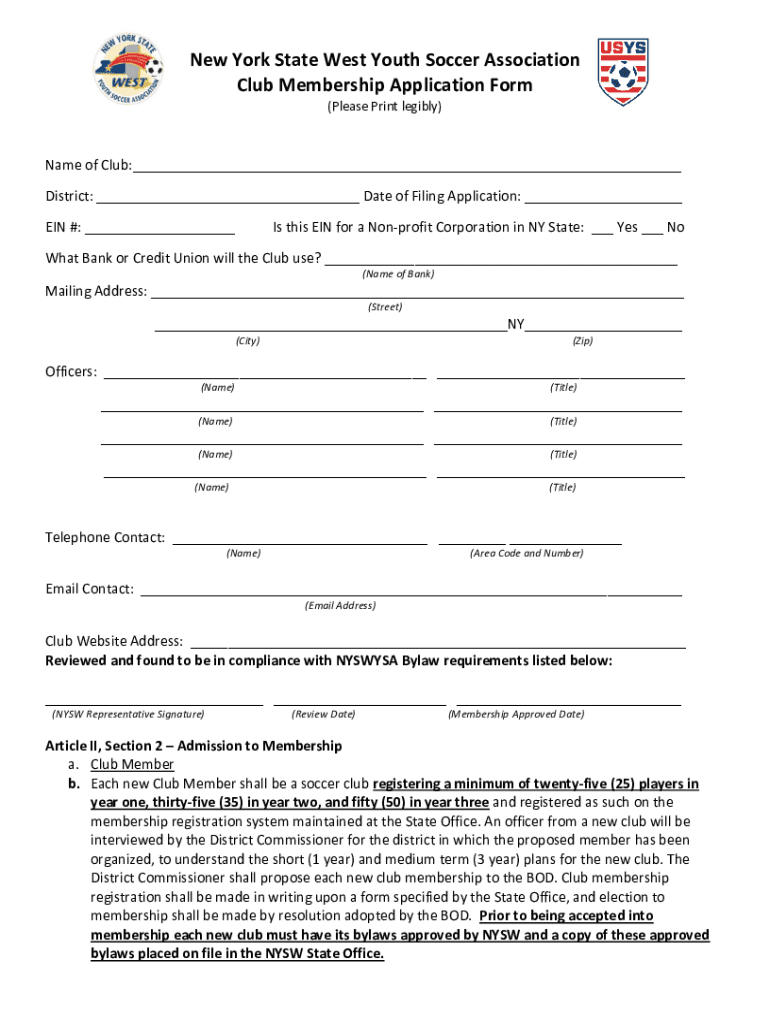 New York State West Youth Soccer Association Club Membership Application Form (Please Print legibly)Name of Club: District: Date of Filing Application: EIN #: Is this EIN for a Nonprofit Corporation