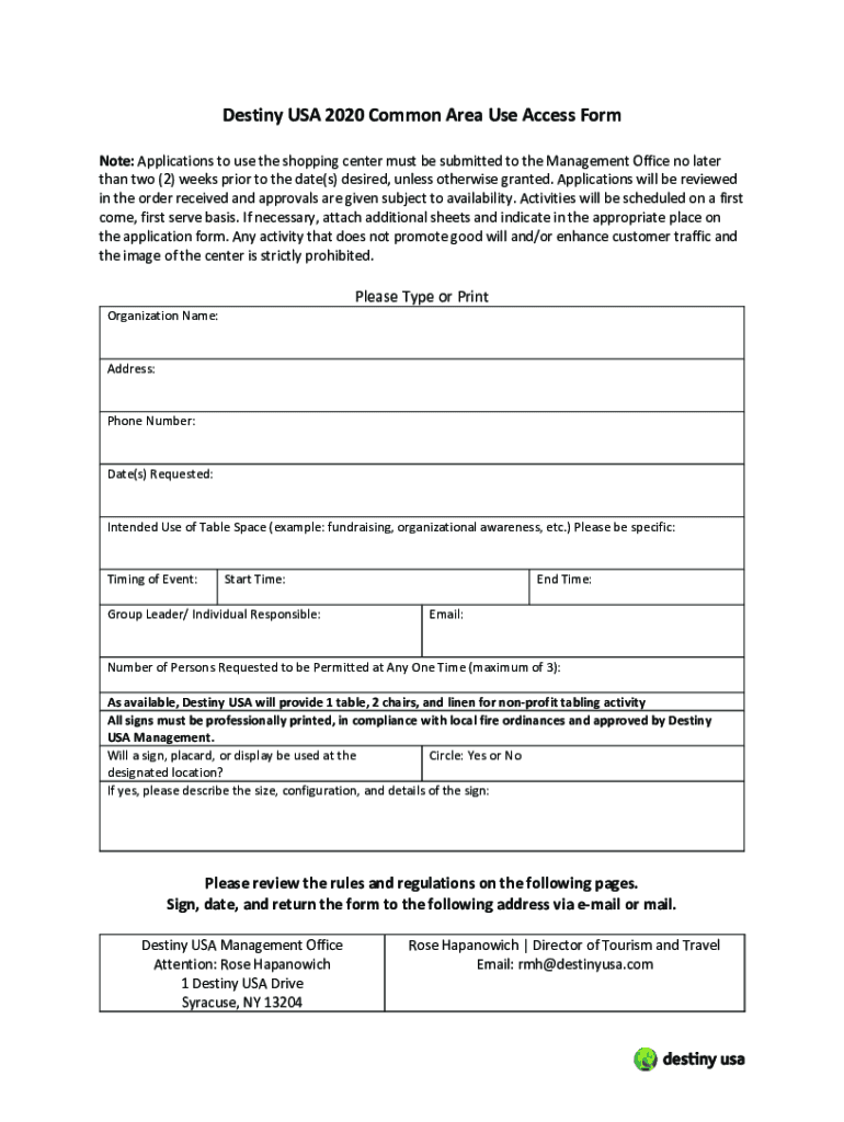 Filling out the destiny usa common area involves completing the designated forms provided by the management of Destiny USA, which may include details about usage and maintenance of the common spaces.