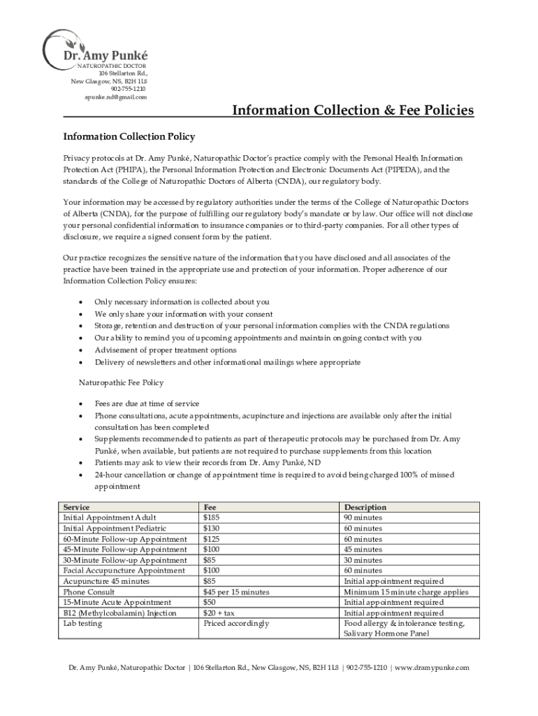 Dr. Amy Punk NATUROPATHIC DOCTOR106 Stellar ton Rd., New Glasgow, NS, B2H 1L8 9027551210 punk. ND Gmail. Conformation Collection & Fee Policies Information Collection Policy Privacy protocols at Dr.