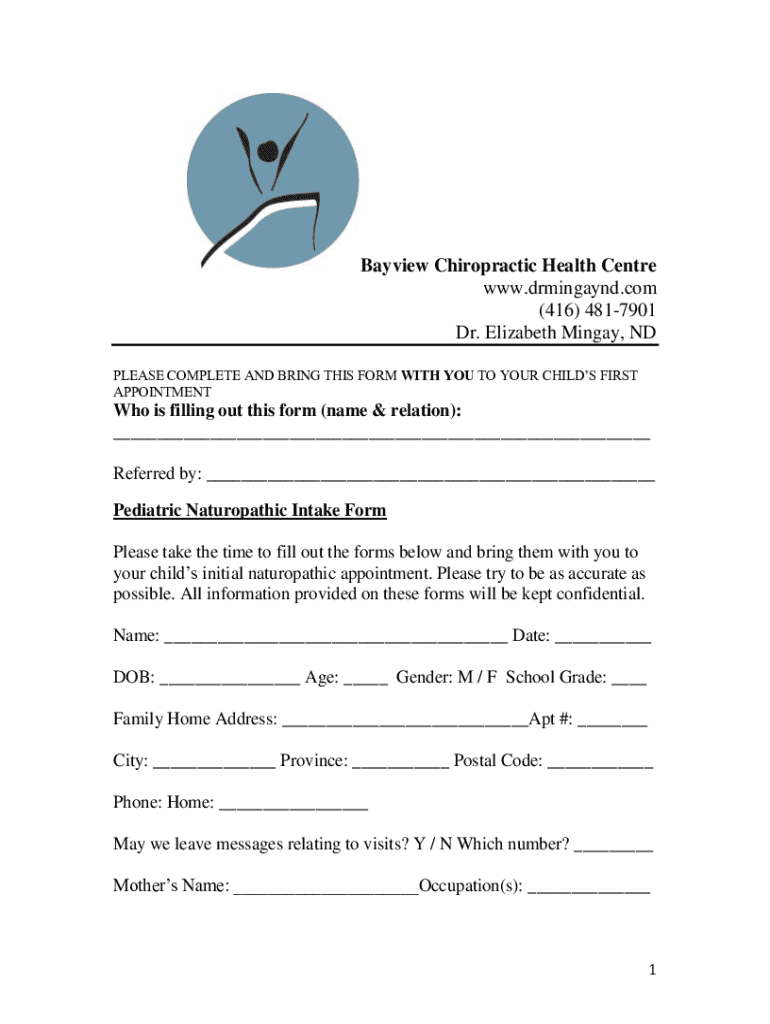 Bayview Chiropractic Health Center www.drmingaynd.com (416) 4817901 Dr. Elizabeth Mingy, ND PLEASE COMPLETE AND BRING THIS FORM WITH YOU TO YOUR CHILD FIRST Appointment is filling out this form (name