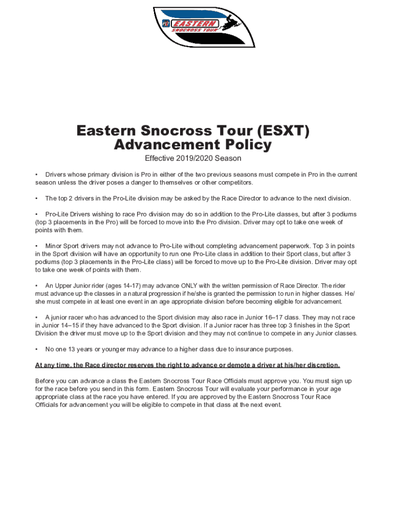 Get the free Eastern Snocross Tour (ESXT) Advancement Policy