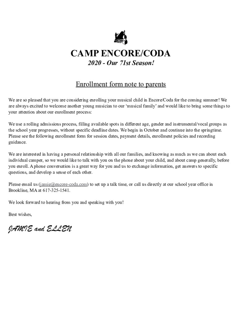 !CAMP ENCORE/CODA 2020 Our 71st Season! Enrollment form note to parents We are so pleased that you are considering enrolling your musical child in Encore/Coda for the coming summer! We are always
