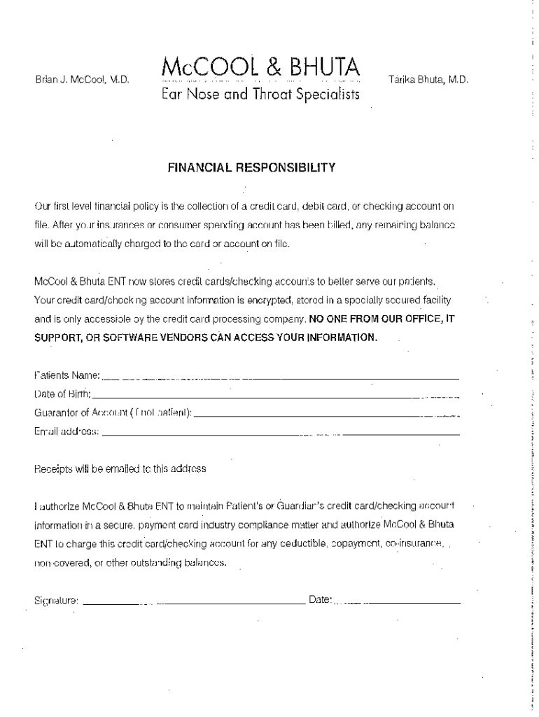 Brian J. School, M.D. School & BHUTATarika Bhutan, M.D. Ear Nose and ThroatSpecialistsFINANCIAL RESPONSIBILITY Our first level financial policy is the collection of a credit card, debit card, or checking