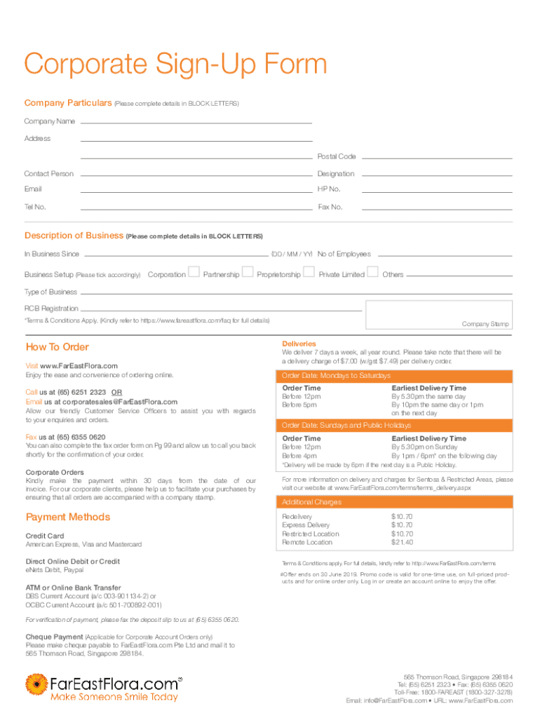 Corporate Sign-up Form Company Particulars (Please complete details in BLOCK LETTERS) Company Name AddressContact PersonPostal Code DesignationEmailHP No. Tel No. Fax No. Description of Business (Please