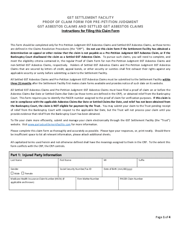 Get the free GST SETTLEMENT FACILITY PROOF OF CLAIM FORM FOR PRE-PETITION ...