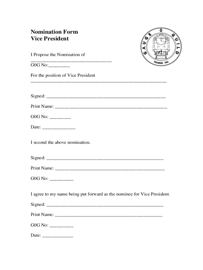 Nomination Form Vice President I Propose the Nomination of G0G No: For the position of Vice President Signed: Print Name: G0G No: Date: I second the above nomination. Signed: Print Name: G0G No: I