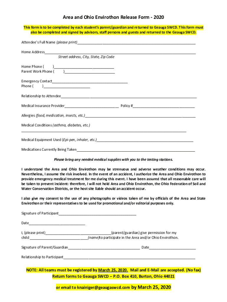Get the free Area 2 and Ohio Envirothon Volunteer Release Form - 2020