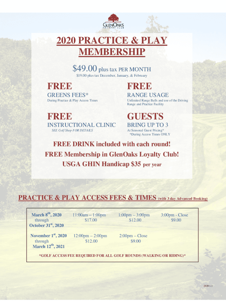 2020 PRACTICE & PLAY MEMBERSHIP $49.00 plus tax PER MONTH $19.00 plus tax December, January, & FebruaryFREEFREEGREENS FEES×RANGE USAGEDuring Practice & Play Access TimesUnlimited Range Balls and