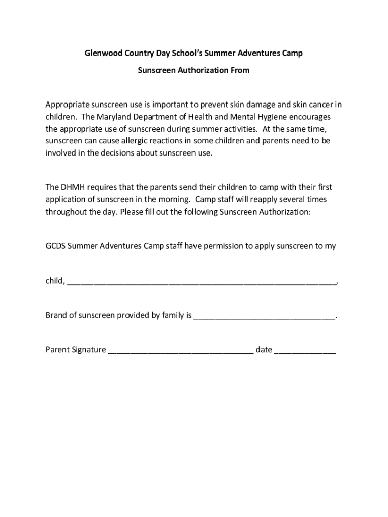 Get the free Sunscreen Authorization From - Glenwood Country Day School