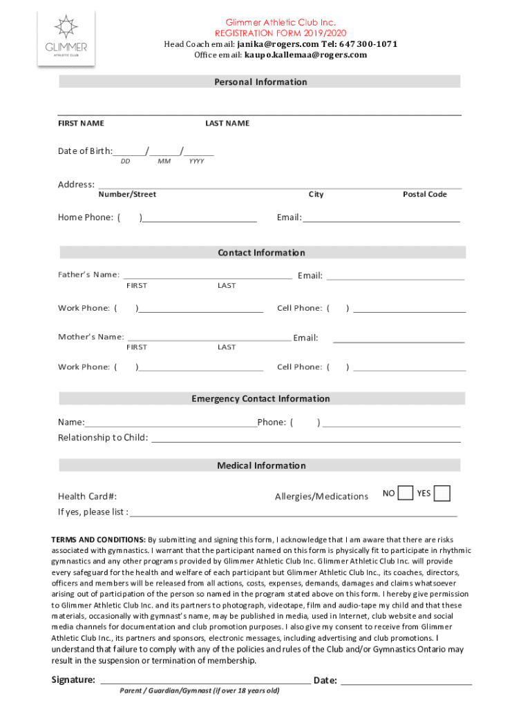 Glimmer Athletic Club Inc. REGISTRATION FORM 2019/2020 Head Coach email: Anika rogers.com Tel: 6473001071Office email: auto. Valletta rogers.comPersonalInformationCLUB FEES 2019/2020 SEASONFIRST NAMELESS
