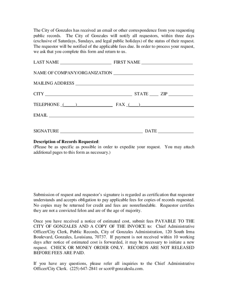 The City of Gonzales has received an email or other correspondence from you requesting public records. The City of Gonzales will notify all requestors, within three days (exclusive of Saturdays, Sundays,