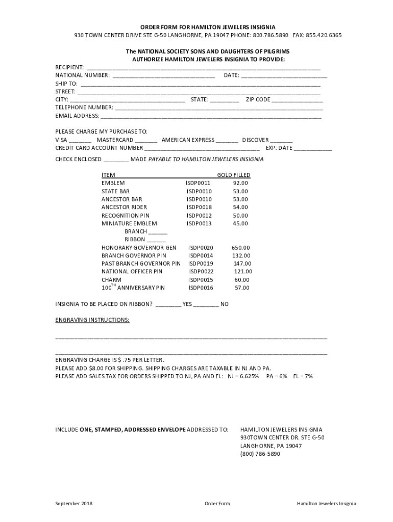 ORDER FORM FOR HAMILTON JEWELERS INSIGNIA 930 TOWN CENTER DRIVE STE G50 LANGHORNE, PA 19047 PHONE: 800.786.5890 FAX: 855.420.6365 The NATIONAL SOCIETY SONS AND DAUGHTERS OF PILGRIMS AUTHORIZE HAMILTON