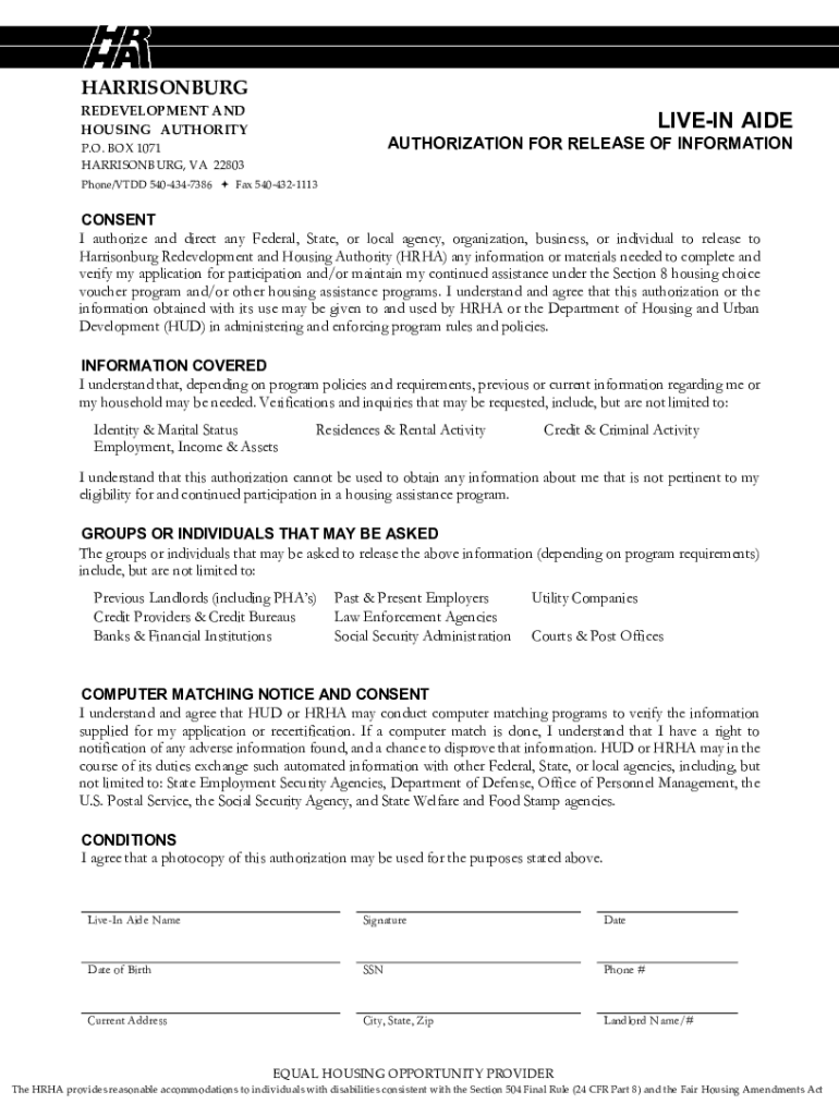 HARRISONBURG REDEVELOPMENT AND HOUSING AUTHORITYLIVEIN PREAUTHORIZATION FOR RELEASE OF INFORMATION. O. BOX 1071 HARRISONBURG, VA 22803 Phone/TDD 5404347386 Fax 5404321113CONSENT I authorize and direct