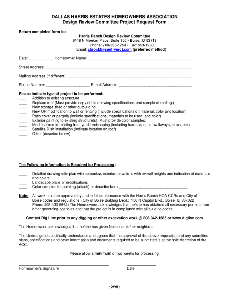 DALLAS HARRIS ESTATES HOMEOWNERS ASSOCIATION Design Review Committee Project Request Form Return completed form to: Harris Ranch Design Review Committee 6149 N Meeker Place, Suite 150 Boise, ID 83713