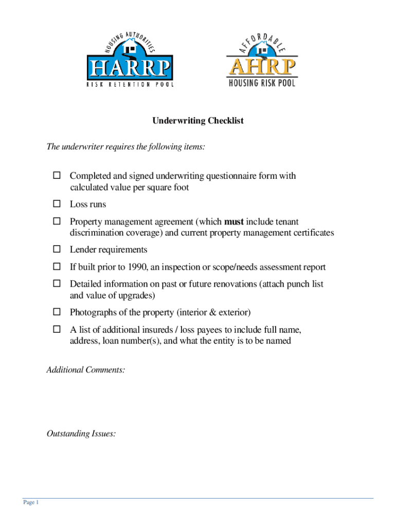 Underwriting Checklist The underwriter requires the following items: Completed and signed underwriting questionnaire form with calculated value per square foot Loss runs Property management agreement