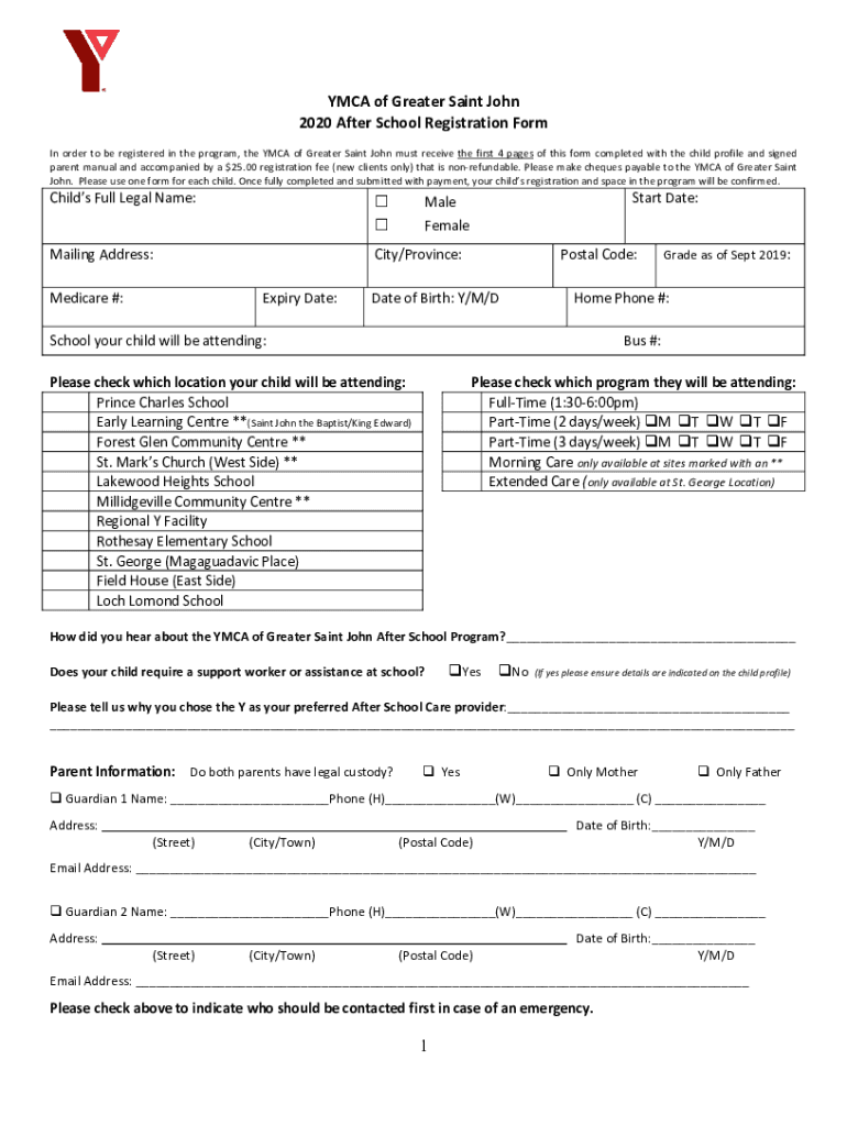In order to be registered in the program, the YMCA of Greater Saint John must receive the first 4 pages of this form completed with the