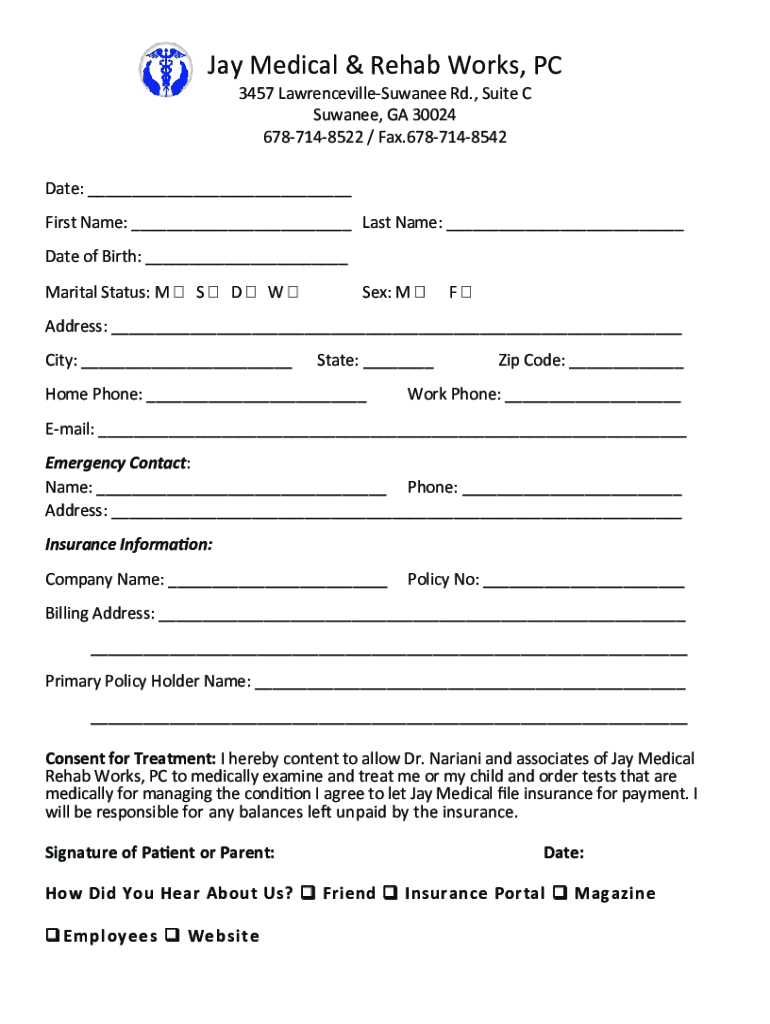 Jay Medical & Rehab Works, PC 3457 LawrencevilleSuwanee Rd., Suite C Suwanee, GA 30024 6787148522 / Fax.6787148542Date: First Name: Last Name: Date of Birth: Marital Status: Essex: Address: City: