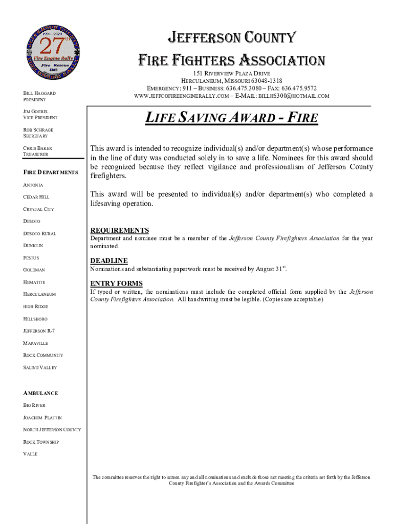 JEFFERSON COUNTY firefighters ASSOCIATION 151 RIVERVIEW PLAZA DRIVE HERCULANEUM, MISSOURI 630481318 EMERGENCY: 911 BUSINESS: 636.475.3080 FAX: 636.475.9572 WWW.JEFFCOFIREENGINERALLY.COM EMAIL: BILLH6300