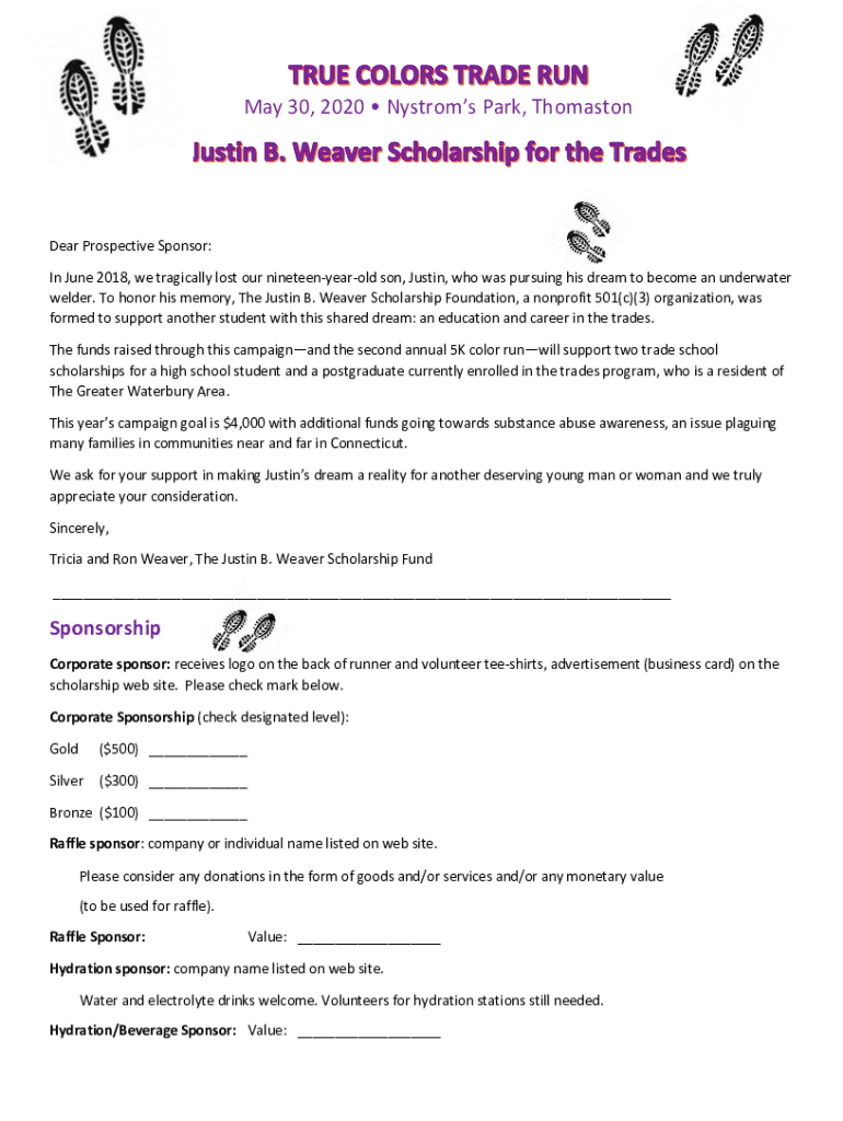 May 30, 2020, Angstroms Park, ThomastonDear Prospective Sponsor: In June 2018, we tragically lost our nineteenyearold son, Justin, who was pursuing his dream to become an underwater welder. To honor