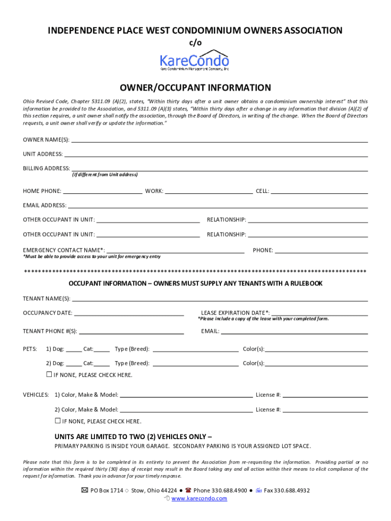 Ohio Revised Code, Chapter 5311.09 (A)(2), states, Within thirty days after a unit owner obtains a condominium ownership