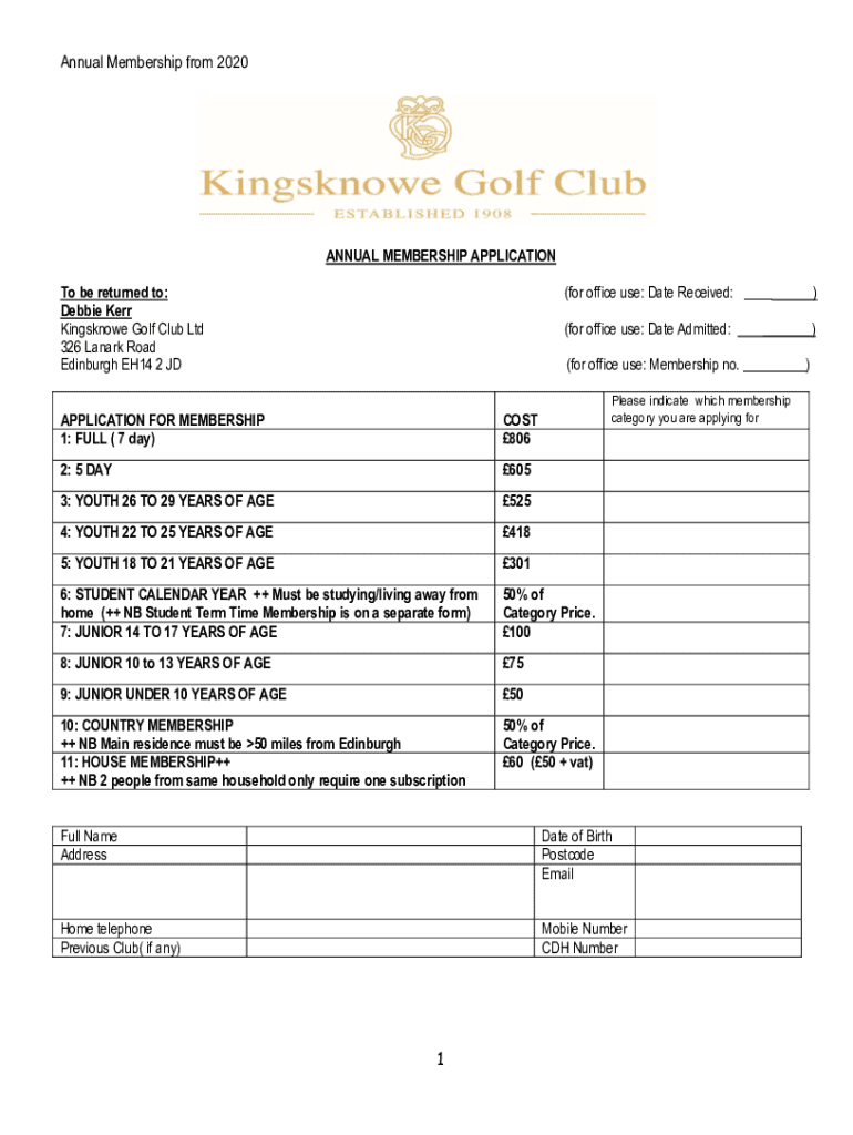 Annual Membership from 2020ANNUAL MEMBERSHIP APPLICATION To be returned to: Debbie Kerr Kingstown Golf Club Ltd 326 La nark Road Edinburgh EH14 2 JD(for office use: Date Received: (for office use: